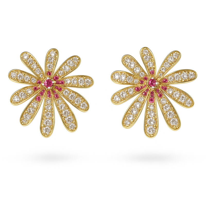 Φέρνουν την κομψότητα της φύσης στα αυτιά σου. Αυτά τα εκθαμβωτικά σκουλαρίκια τύπου cluster με σχέδιο λουλουδιού, είναι φτιαγμένα από ορείχαλκο και διακοσμημένα με κυβικά ζιρκόνια υψηλής λάμψης, ολοκληρωμένα με επιχρύσωση 18 καρατίων για αίσθηση απόλυτης πολυτέλειας.